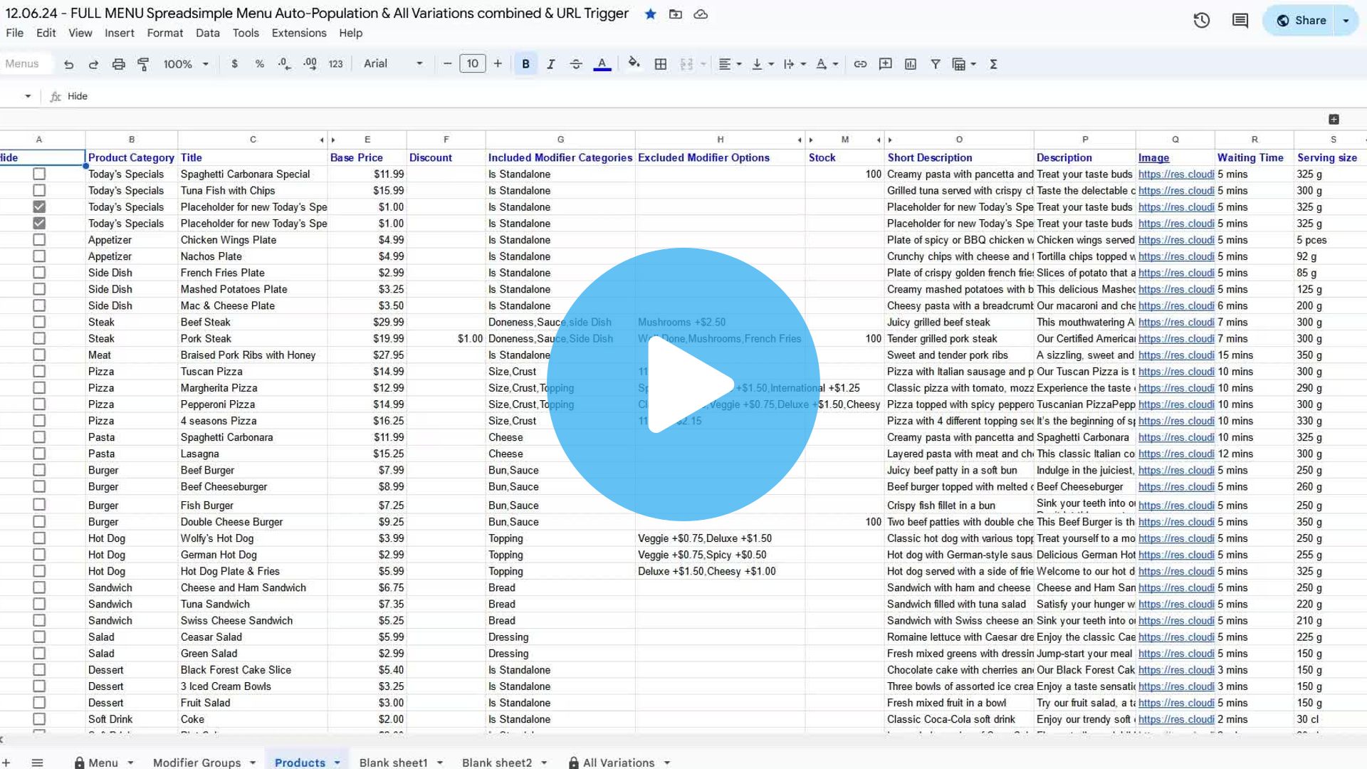 You may update sheets "Products" and "Modifier Groups". MAKE SURE TO CREATE BACKUPS by right-clicking on the sheet in in your Google Drive and "Make a Copy". Then rename it as "Backup and the name you'd like" (Note that you are the owner of the Google sheet. You are responsible for the data. In case of data loss, eBizprof Digital won't be able to recover data, we do not have your data in our end.)